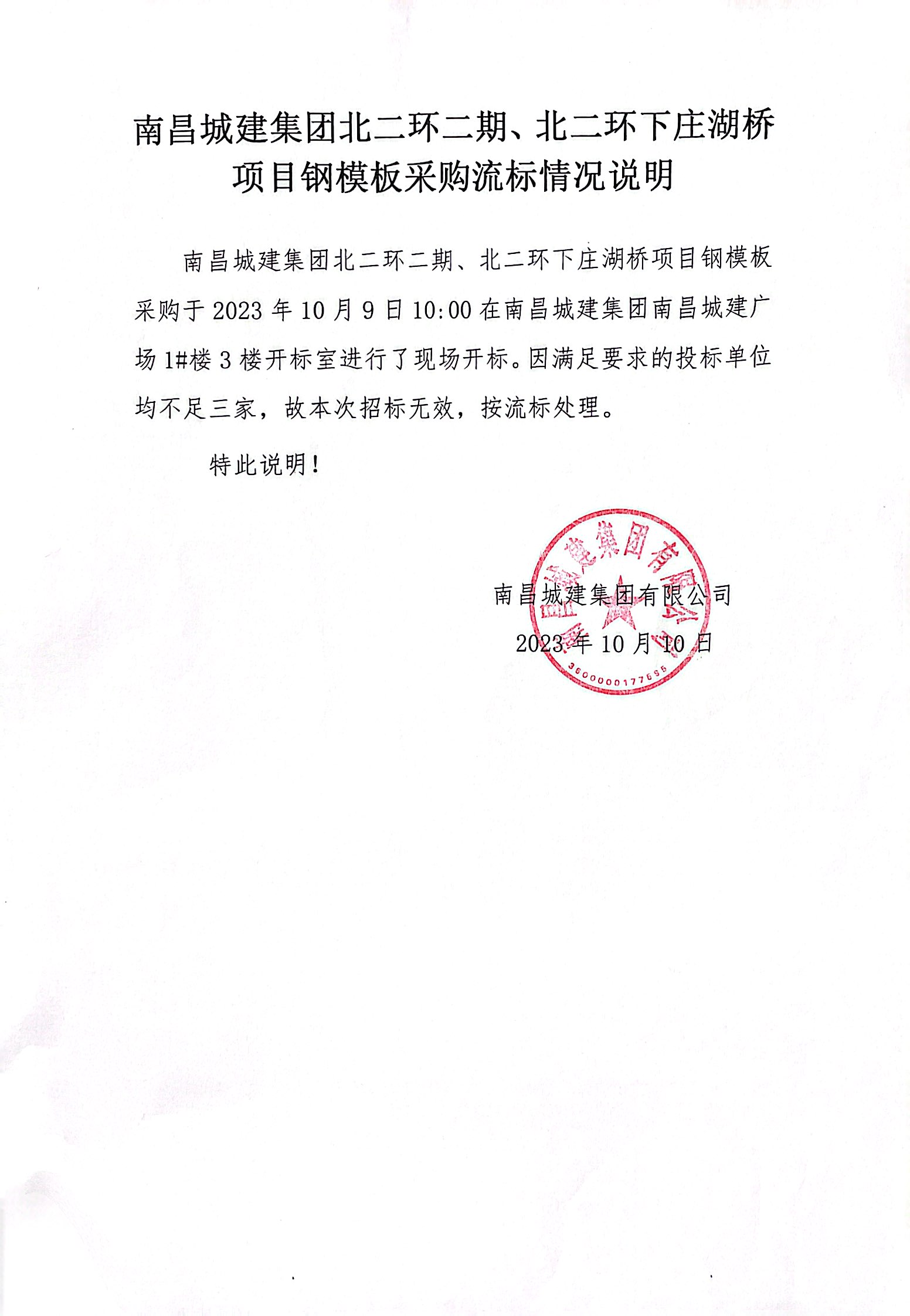 威廉体育集团北二环二期、北二环下庄湖桥项目钢模板采购于2023年10月9日10:00在威廉体育集团威廉体育广场1#楼3楼开标室进行了现场开标。因满足要求的投标单位均不足三家,故本次招标无效,按流标处理。
