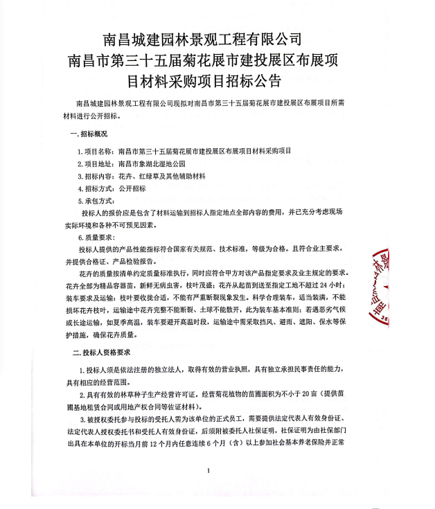 威廉体育园林景观工程有限公司现拟对南昌市第三十五届菊花展市建投展区布展项目所需材料进行公开招标。