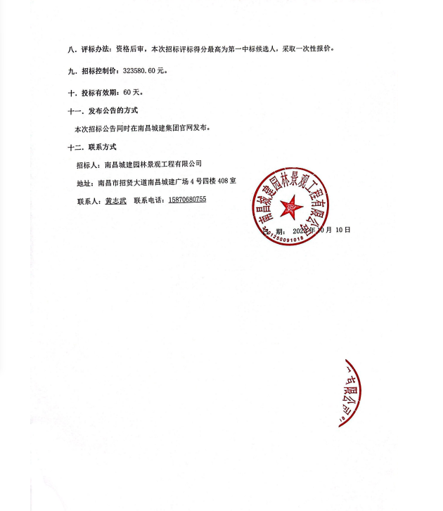 八.评标办法:资格后审,本次招标评标得分最高为第一中标候选人,采取一次性报价。