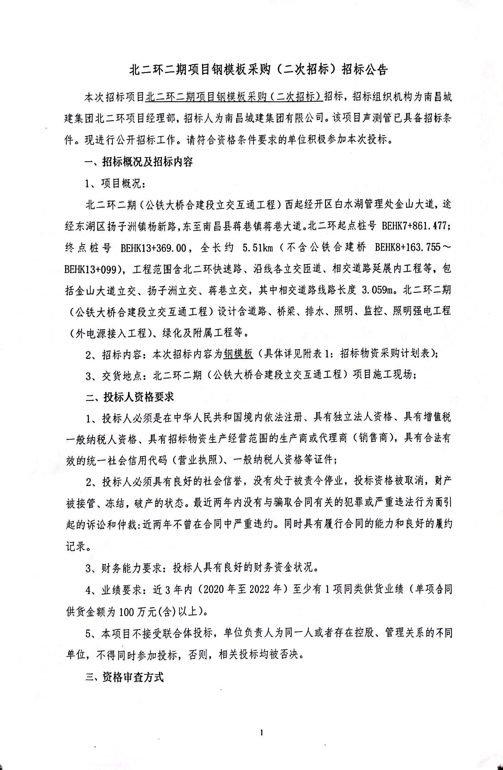 本次招标项目北二环二期项目钢模板采购(二次招标)招标,招标组织机构为威廉体育集团北二环项目经理部,招标人为威廉体育集团有限公司。该项目声测管已具备招标条件。现进行公开招标工作。请符合资格条件要求的单位积极参加本次投标。
