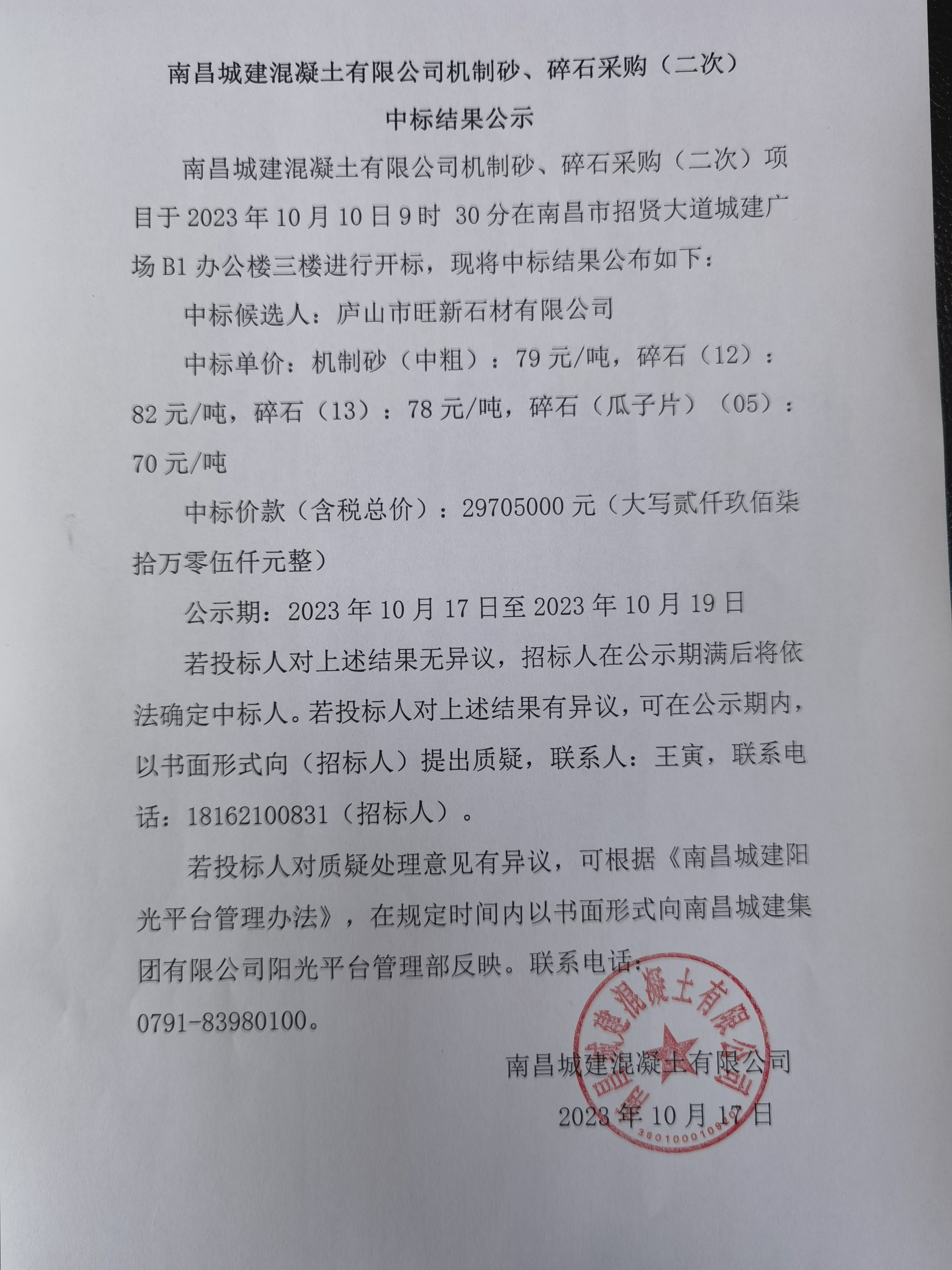 威廉体育混凝土有限公司机制砂、碎石采购(二次)项目于2023年10月10日9时 30分在南昌市招贤大道城建广场B1办公楼三楼进行开标,现将中标结果公布如下: