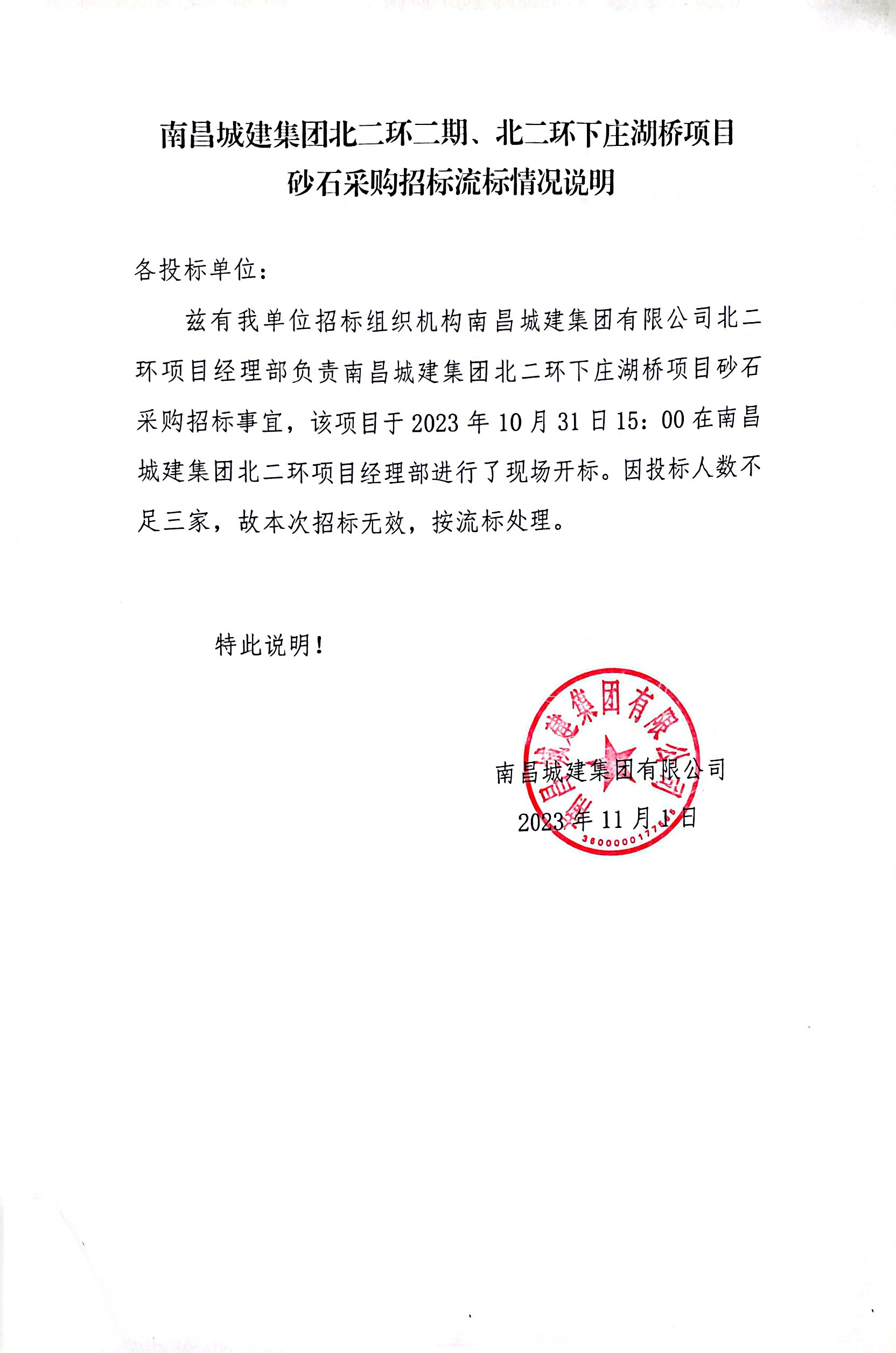 兹有我单位招标组织机构威廉体育集团有限公司北二环项目经理部负责威廉体育集团北二环下庄湖桥项目砂石采购招标事宜,该项目于2023年10月31日15:00在威廉体育集团北二环项目经理部进行了现场开标。因投标人数不足三家,故本次招标无效,按流标处理。