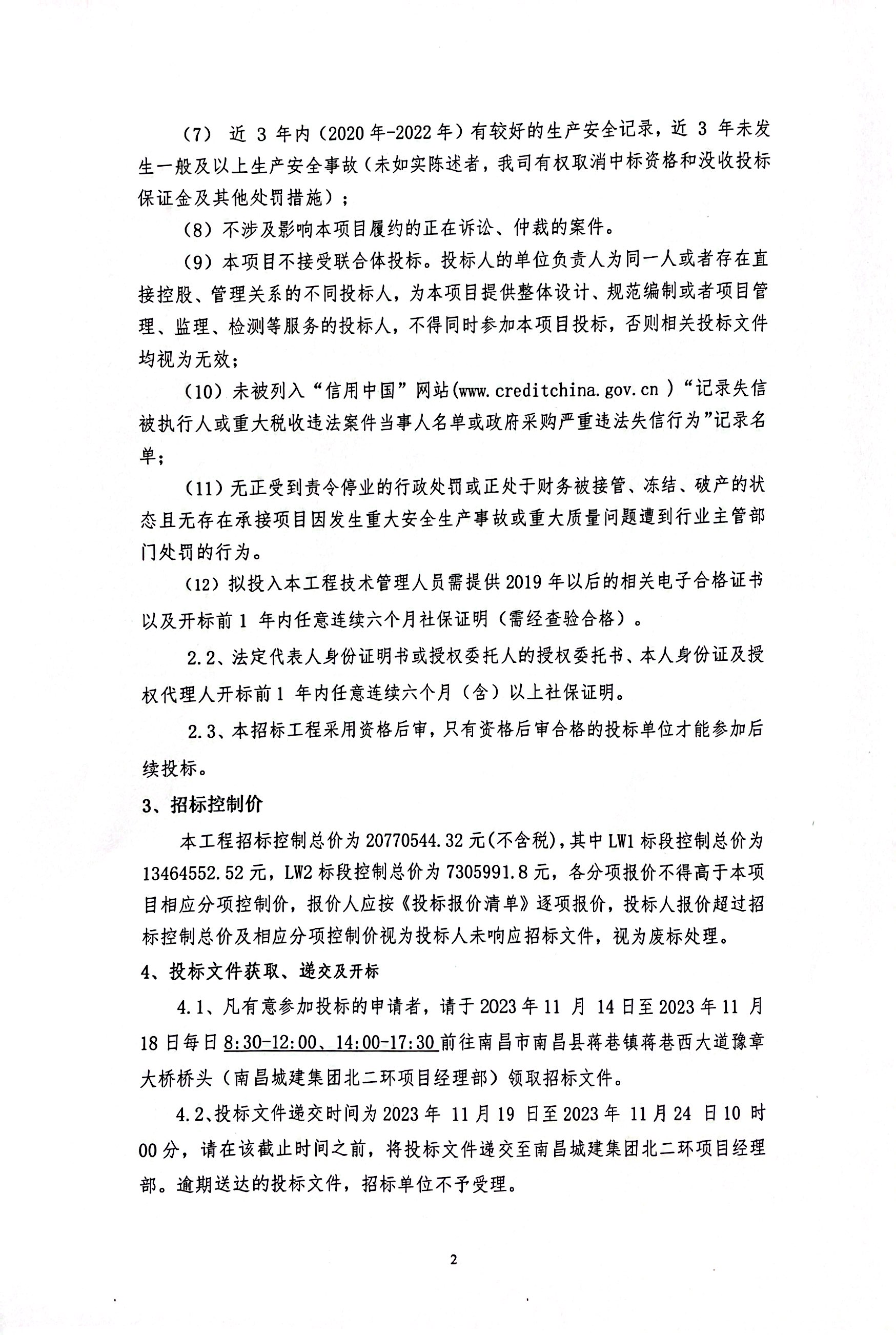 本工程招标控制总价为20770544.32元(不含税),其中LW1标段控制总价为13464552.52元,LW2标段控制总价为7305991.8元,各分项报价不得高于本项目相应分项控制价,报价人应按《投标报价清单》逐项报价,投标人报价超过招标控制总价及相应分项控制价视为投标人未响应招标文件,视为废标处理。