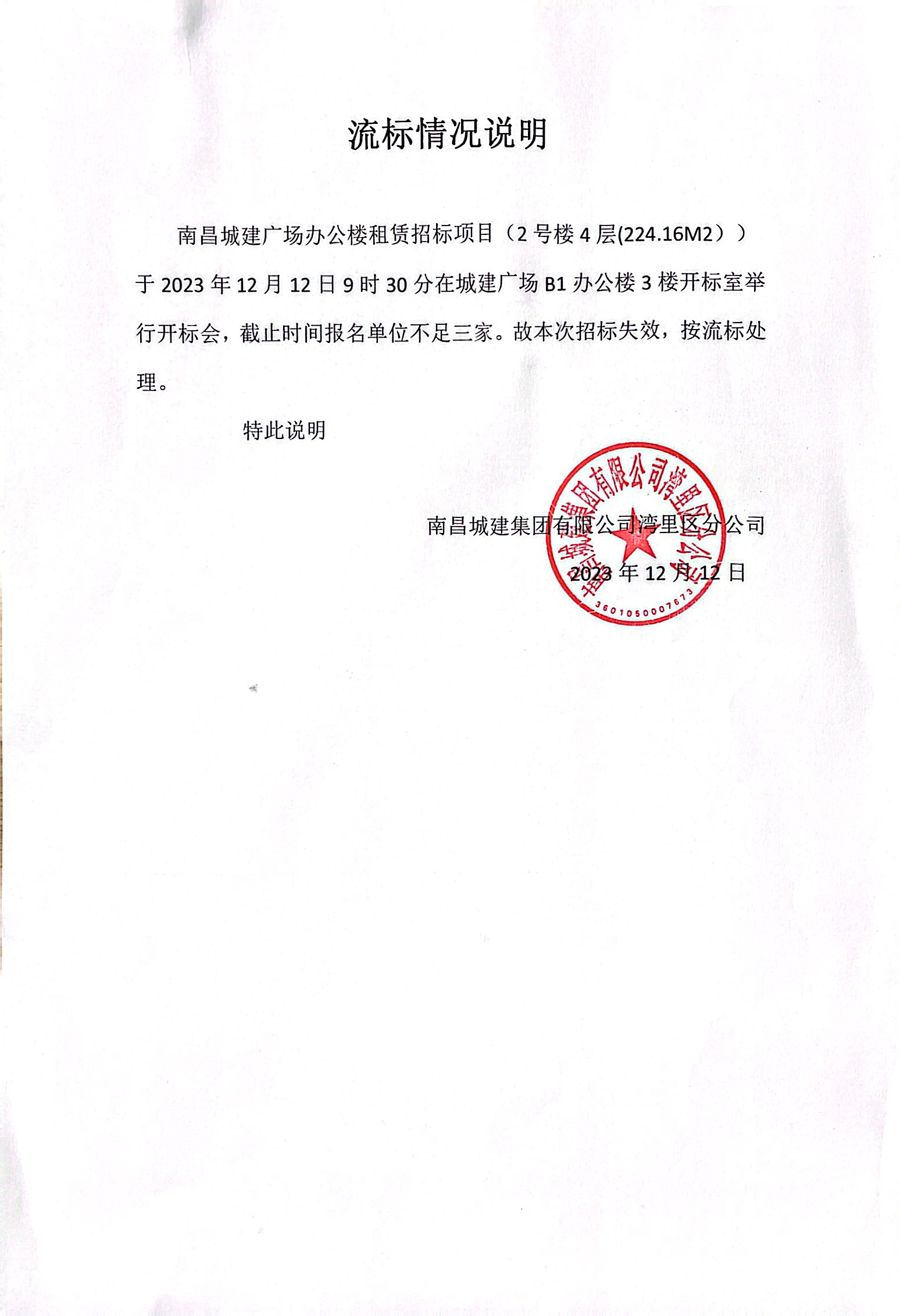 威廉体育广场办公楼租赁招标项目(2号楼4层(224.16M2))于2023年12月12日9时30分在城建广场B1办公楼3楼开标室举行开标会,截止时间报名单位不足三家。故本次招标失效,按流标处理。