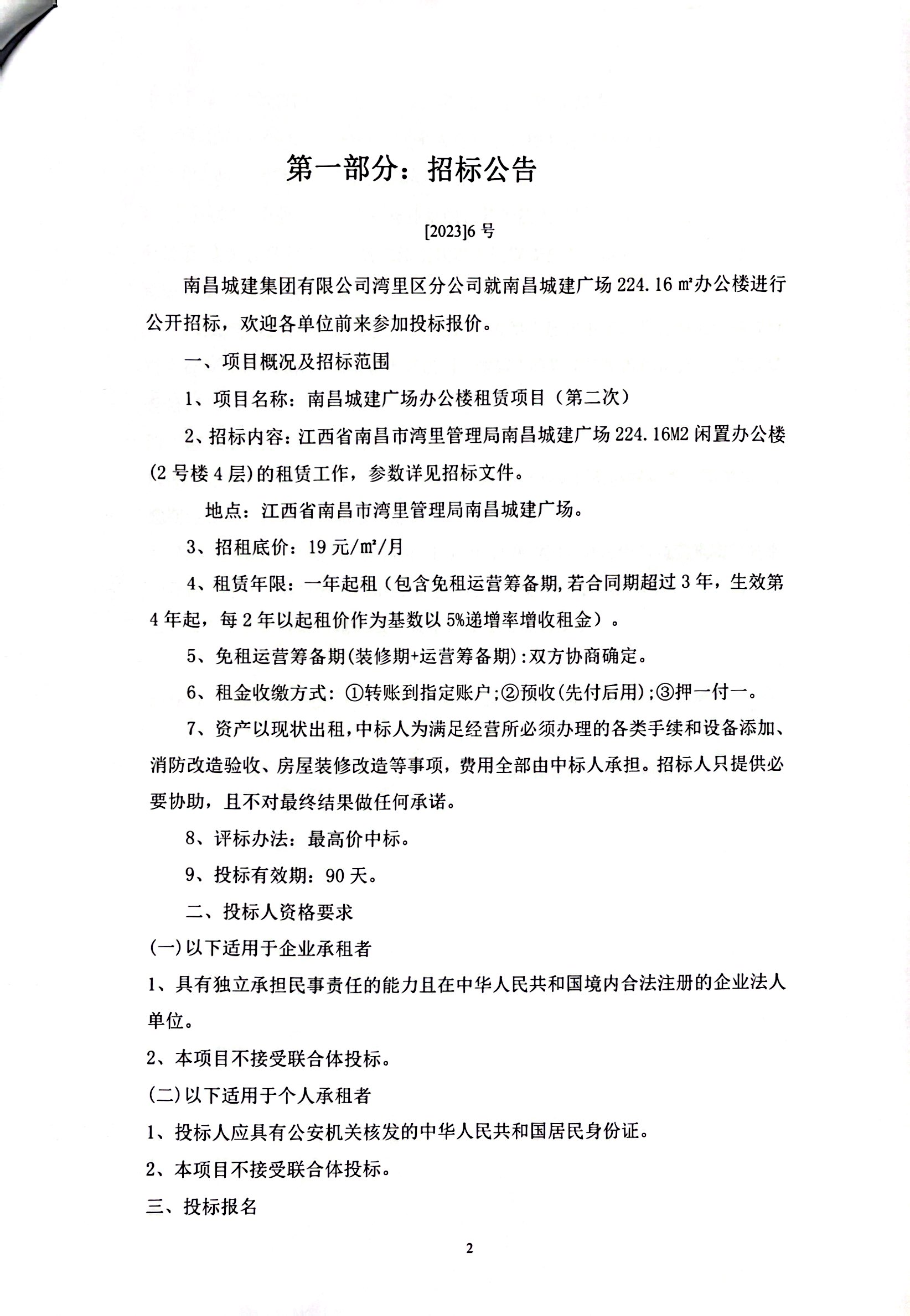2、招标内容:江西省南昌市湾里管理局威廉体育广场224.16M2闲置办公楼(2号楼4层)的租赁工作,参数详见招标文件。