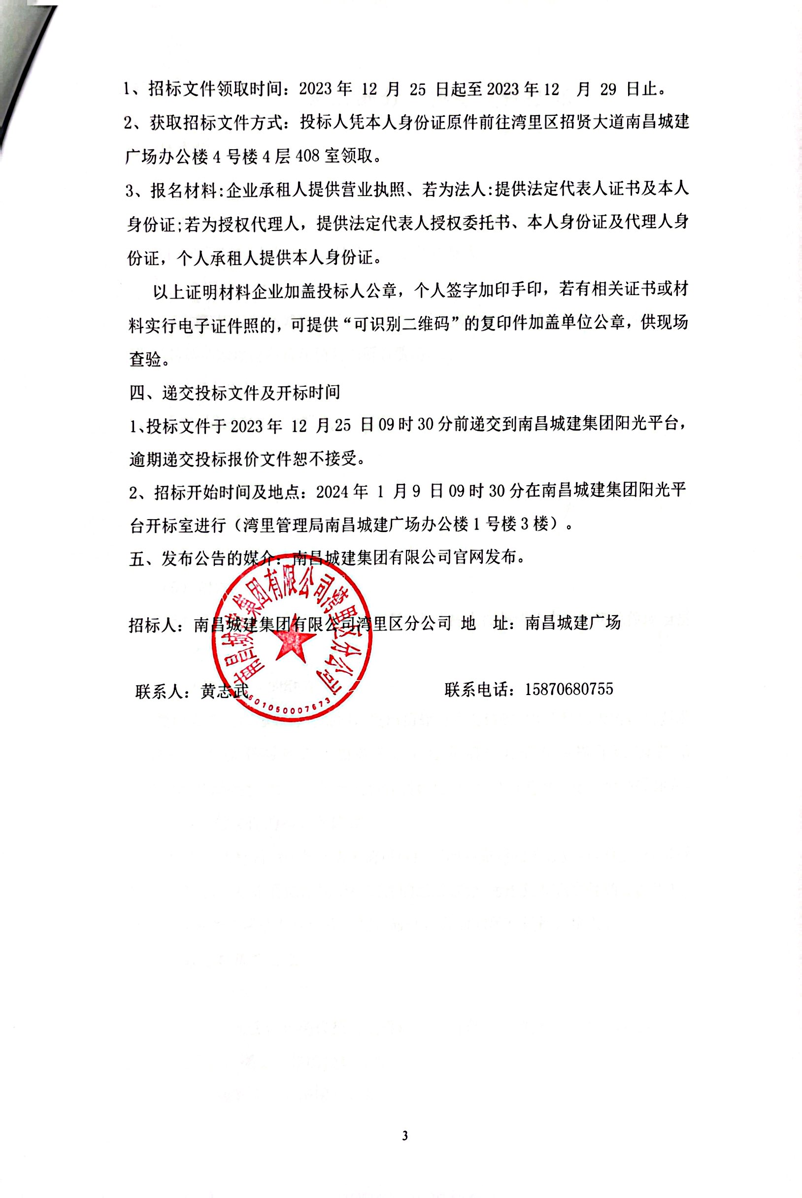 2、招标开始时间及地点:2024年 1 月9 日09时30分在威廉体育集团阳光平台开标室进行(湾里管理局威廉体育广场办公楼1号楼3楼)。