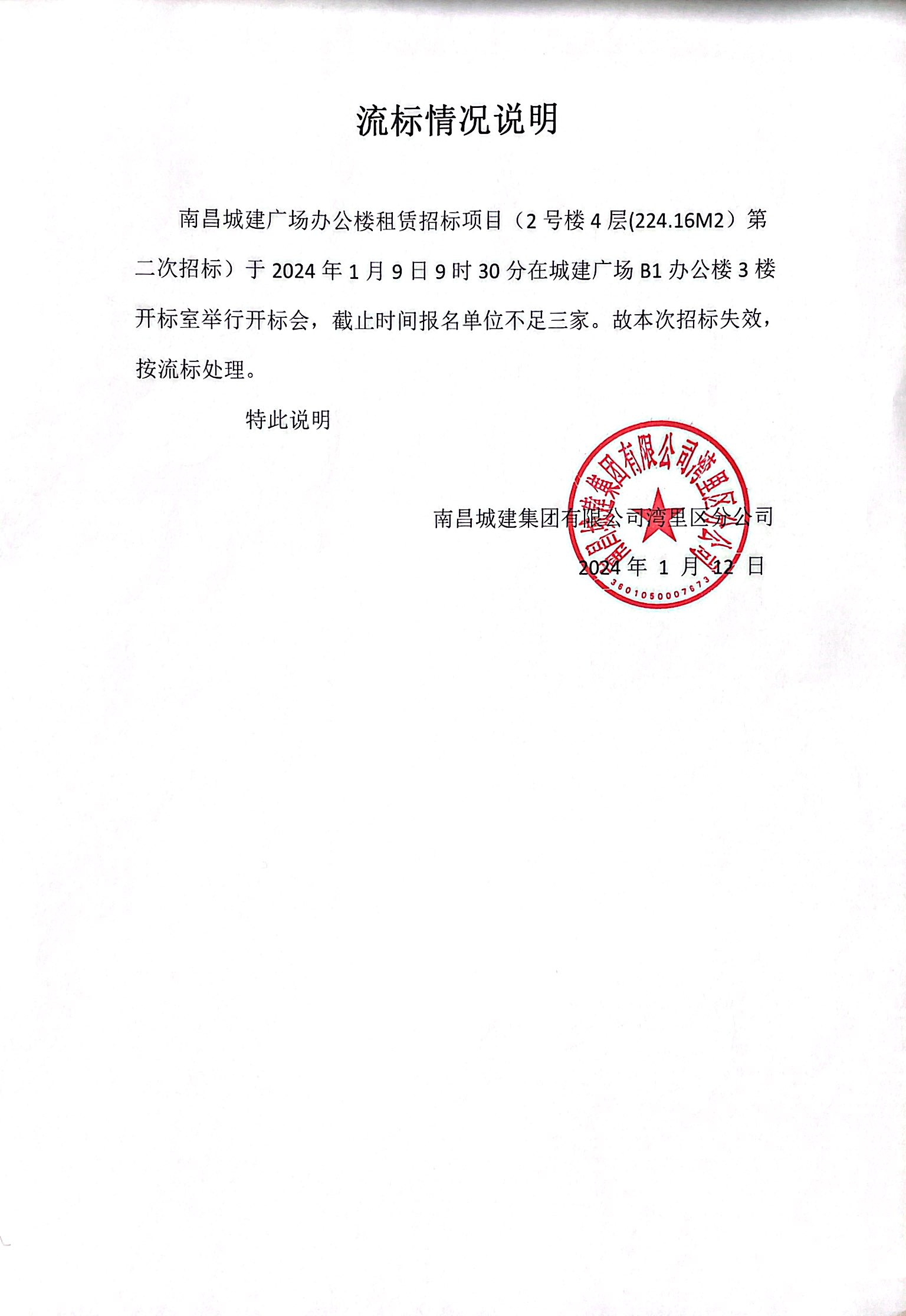 威廉体育广场办公楼租赁招标项目(2号楼4层(224.16M2)第二次招标)于2024年1月9日9时30分在城建广场B1办公楼3楼开标室举行开标会,截止时间报名单位不足三家。故本次招标失效,按流标处理。